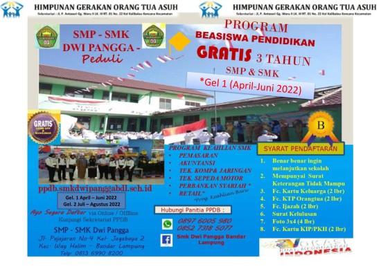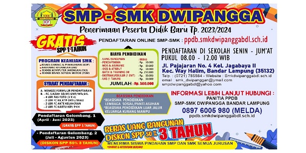PPDB SMP - SMK DWI PANGGA dilaksanakan secara Offline dan Online. Bagi calon siswa silahkan mengisi formulir pendaftaran secara online atau datang langsung ke sekolah